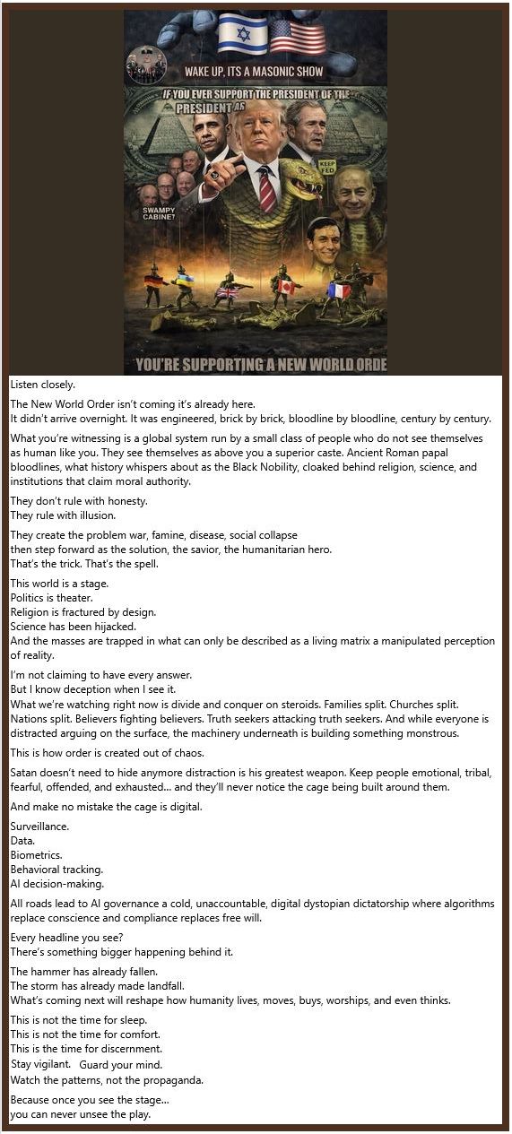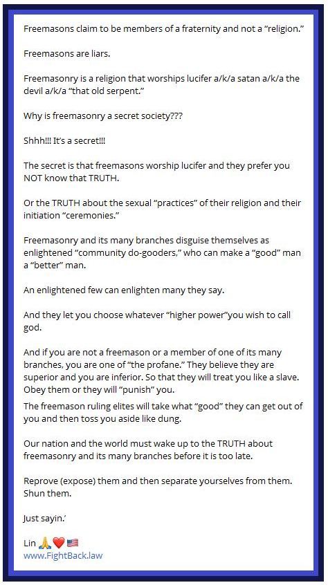 Freemasons (MANY in disguise) and members of the MANY branches of freemasonry will talk Jesus Christ and even be skilled at quoting the Holy Bible.