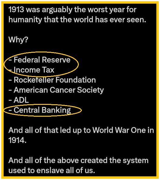 A band of criminals got together a century ago and decided they were going to own the world, hold all of the power, create and hoard all of the money, and keep everyone on a constant spin cycle to fool them.